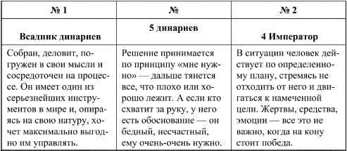 Человек ведет себя подобным образом, потому что ему нужно (5 динариев) и потому что он умеет и может управлять процессом – Всадник динариев и 4 Император. Он берет контроль над ситуацией, которая его интересует.