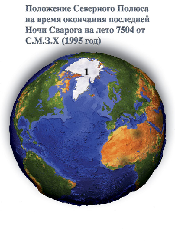 Резко изменилось положение не только полюсов планеты, но и расположение климатических поясов. При этом, если бы Даария не погрузилась бы под воду ранее, Северный Полюс полностью бы накрыл её собой, так же, как это произошло с Антарктидой. Которая до этой катастрофы была покрыта тропическими лесами и в одночасье, оказалась в зоне Южного Полюса холода. Сдвижка тектонических платформ вызвала на долгое время вулканическую активность. Выбрасываемый вулканами в атмосферу пепел, мельчайшие частички пыли, попадая в верхние слои атмосферы, создавали дополнительный экран. Этот экран отражал часть солнечных лучей, в результате этого понизилась средняя температура планеты. Понижение планетарной температуры привело к началу ледникового периода. Всё произошло настолько быстро, что полярные льды старых полюсов ещё не успели растаять, как вокруг новых полюсов образовались новые полярные ледники, значительно больших размеров, чем размеры «старых». В результате всего этого, новые полюса Мидгард — Земли «надели» мощные «шапки» полярных льдов (Рис. 20).