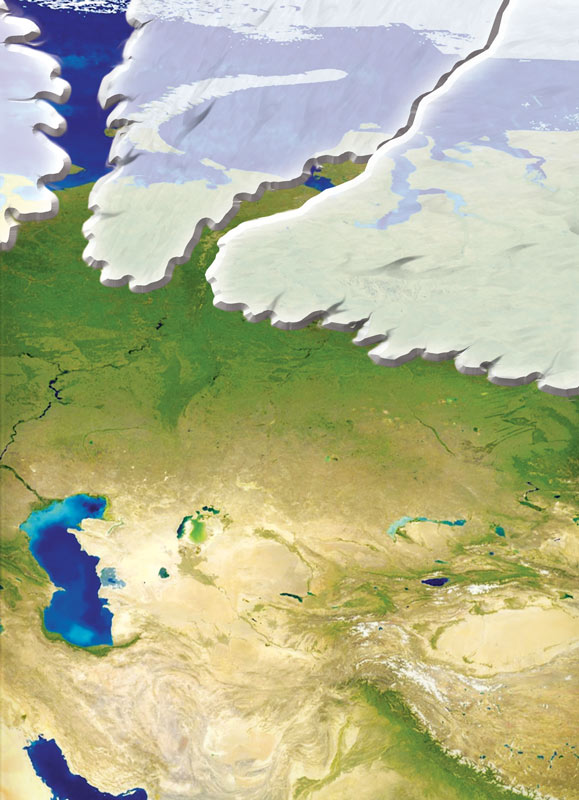 Весь север Евразии покрылся ледниками. Ледники, при своём движении на юг во время Великого Похолодания (ледникового периода), стёрли с лица земли грандиозные сооружения наших предков. Наступление ледников заставило наших предков уходить на юг и юго–восток, беря с собой только самое необходимое. Но на юге были высочайшие на Мидгард — Земле горные массивы. И волны переселенцев вынуждены были двигаться на юго–восток и юго–запад. Таким образом, переселенцы разделились на два потока. Но, при всём при этом, часть людей всё–таки остаются на юге Западной Сибири — там, куда не добрался ледник (Рис. 21).