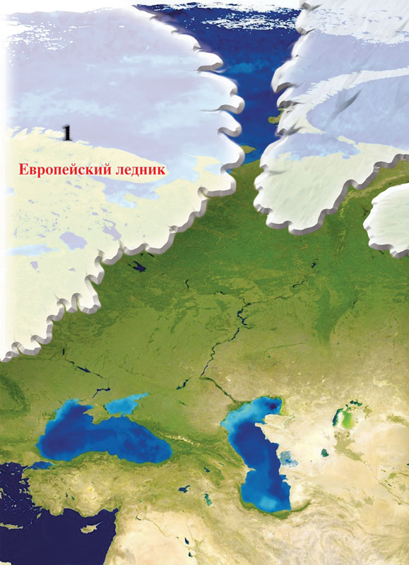При этом Асгард — Ирийский (ныне Омск) избежал участи быть стёртым с лица земли надвигающимся ледником и продолжал быть центром Славяно — Арийской Империи. Большая часть Европы во время Великого Похолодания была покрыта льдами. Европейский ледник двигался с запада на восток, так как на юге Европы горные массивы Альп и Карпат, не позволили леднику двигаться в южном направлении. Следует напомнить о том, что европейский ледник остался в «наследство» от старого Северного Полюса в силу того, что изменение наклона земной оси произошло резко и «старый» ледник не только не успел растаять, но и стал быстро расти во время Великого Похолодания. И при этом росте в восточном направлении он, практически полностью, покрывал равнину, впоследствии ставшую называться Русской (Восточно — Европейской) равниной (Рис. 22).