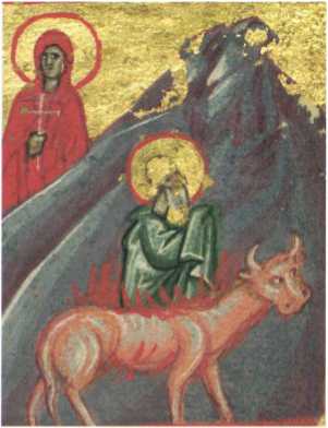 После этих слов нечестивые схватили святого мужа и повлекли к храму Артемиды, где находился медный вол. Раскалив этого вола, они бросили в него святого мученика. Он же, сотворив крестное знамение, молился Богу, взывая:
