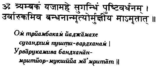 Склоняюсь перед трехглазым Господом Шивой, исполненным сладкого благоухания, питающим всех людей. Да освободит Он меня от уз сансары и смерти, как созревший плод отделяют от побега. Да утвержусь я в бессмертии!