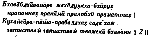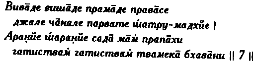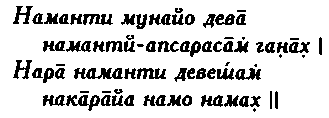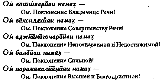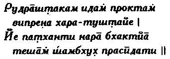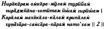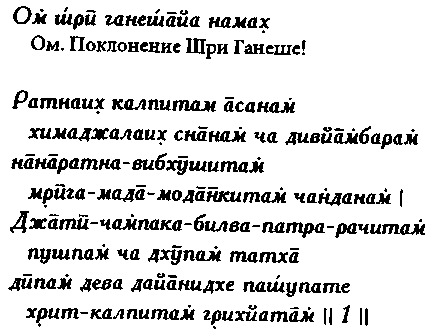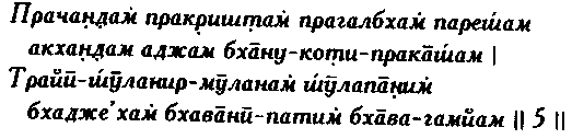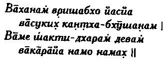 Падаю ниц перед Богом богов, воплощенным в слоге «ва», Чьи очи — солнце, луна и огонь, Кому во все времена молятся и Кого почитают боги и великие мудрецы, подобные Васиштхе, Агастье и Гаутаме.