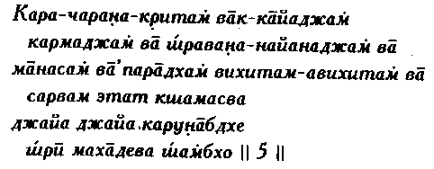 Я сделал все это, чтобы почтить Твои стопы и искупить все содеянное действиями и оскорблениями моего ума, моих рук, ног, тела, глаз, моих речи и слуха, о Снисходительный ко всем! Слава, слава преисполненному сострадания Шри Маха-деве Шамбху!