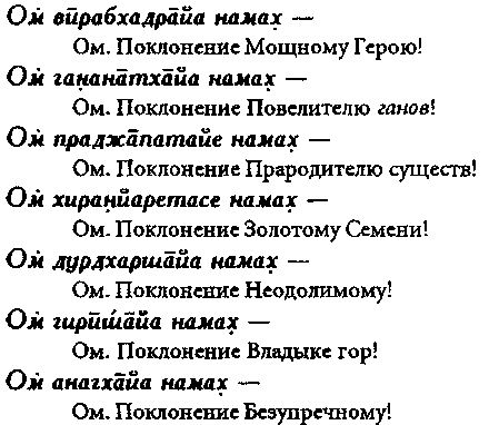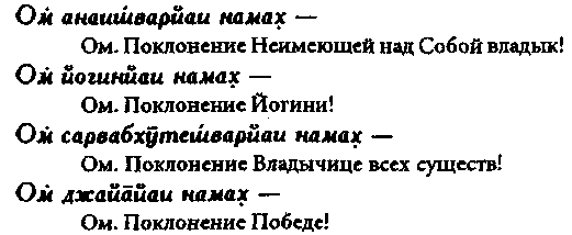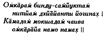 Вечное наше поклонение слогу «ом», на котором йогины в глубокой медитации постоянно сосредоточивают свой ум и который удовлетворяет все желания и дарует вечное спасение.