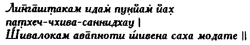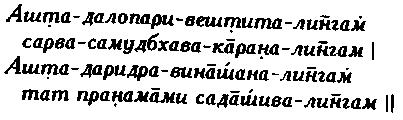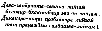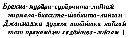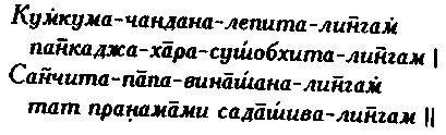 Я склоняюсь перед тем Лингамом Садашивы, уничтожителя бога любви, Которому поклоняются святые мудрецы и боги, исполненным бесконечного сострадания, посрамившим гордыню демона Раваны.