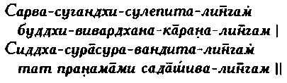 Я склоняюсь перед тем Лингамом Садашивы, обильно умащенным разнообразными благовониями и притираниями, возбуждающим силу мышления, воспламеняющим светильник различения, перед Которым падают ниц сиддхи, боги и демоны.