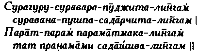 Я склоняюсь перед тем Лингамом Садашивы, Который — трансцендентное Бытие и Высшее Я, Которого все боги во главе со своим верховным жрецом почитают подношениями бесчисленных цветов из божественных небесных садов.
