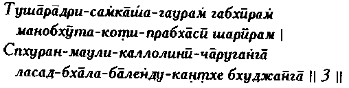 Той, Чье тело сияет столь же ярко, как полированное золото, Тому, Чье тело сияет столь же ослепительно, как белая камфора; Той, что носит прекрасный головной убор, и Тому, Чьи длинные кудри спутаны, — Гаури и Господу Шиве да поклонимся!