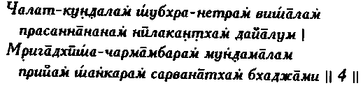 Высшего Господа, Великого и Грозного, Всевышнего, беспредельного, Нерожденного, в миллион раз Превосходящего Своим сиянием лунный свет. Славлю Держателя трезубца, Причину мира, Супруга Богини Бхавани!