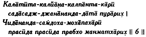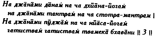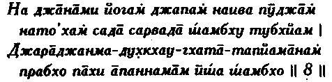 Не знаю я ни йоги, ни джапы, ни порядка пуджи, но всегда постоянно стараюсь служить Тебе, о Шамбху! О Господь, от всех страданий рождения и старости, от любых угрожающих мне бед спаси, о Шамбху!