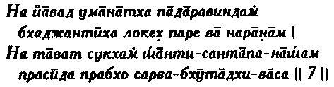 Окажи мне хотя бы ничтожную часть Твоей милости, о Пурари, всегда готовый даровать высшее блаженство! О Сознание и Блаженство! Уничтожь мои страдания и заблуждения, смилуйся, смилуйся, о Господь, погубивший Манматху (богавож-деления и любви)!