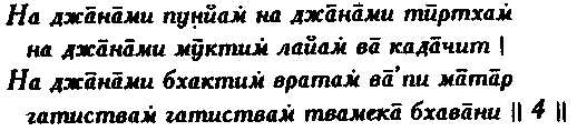 Я не знаю добродетели, не знаю паломничества, я не знаю ни освобождения, ни соединения с Высшим, я не знаю преданности, не знаю обетов аскезы, о Мать, — только Ты мое Прибежище, Ты — Прибежище, Ты Единственная, о Бхавани!