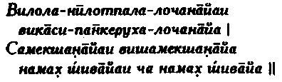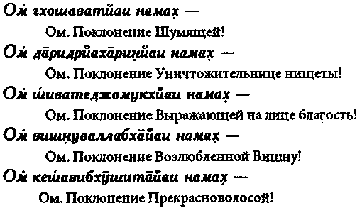 Той, Чьи волосы украшены гирляндами сладко благоухающих божественных цветов, Тому, Чью шею украшает гирлянда из черепов; Той, Что облачена в прекрасные божественные одеяния, и Тому, Чье одеяние — четыре стороны света, — Гаури и Господу Шиве да поклонимся!