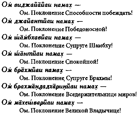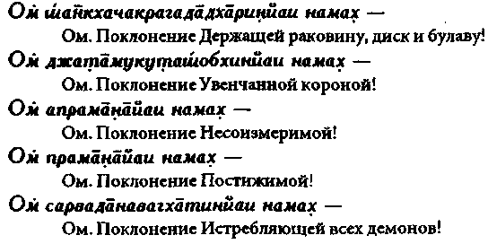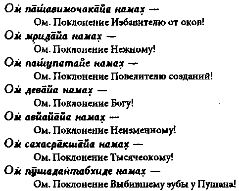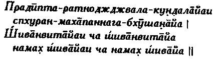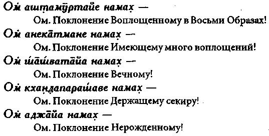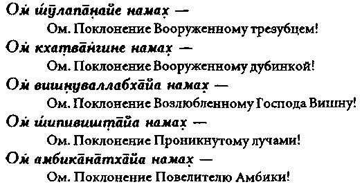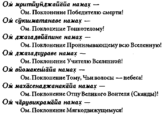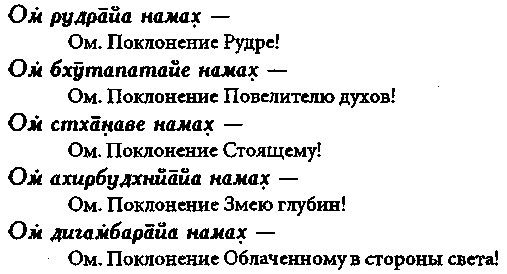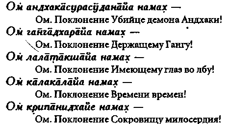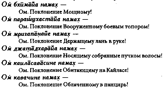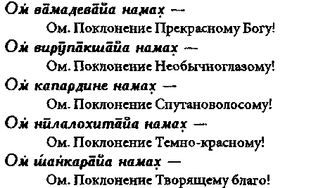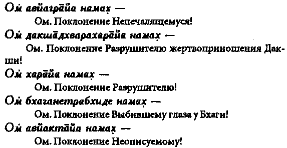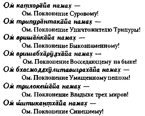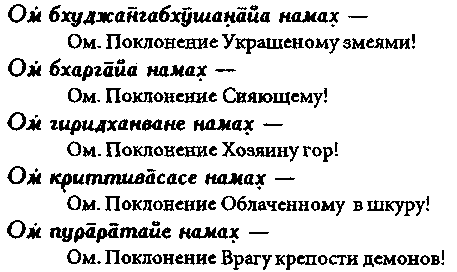 «Ом! Поклонение Господу Нилакантхе, Возлюбленному Умы, трехокому и тысячерукому Шамбху, уничтожающему врагов Своей могучей доблестью!