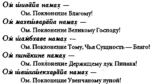 Повторяющий перед Господом Шивой эту молитву, состоящую из пяти священных слогов, достигнет Его высочайшей обители и вместе с Ним насладится вечным блаженством.