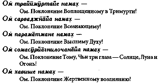 Предлагаю драгоценные подношения, сиденье, а также прохладную воду для омовения, чудесные божественные одежды, всевозможные украшения, шкуру антилопы и ароматный сандал. Украшаю цветами дерева чампака и листьями Сильвы, а также подношу цветы, благовония, светильник — все это в сердце своем предлагаю Тебе, о Боже, Пашупати, исполненный милосердия и любви.