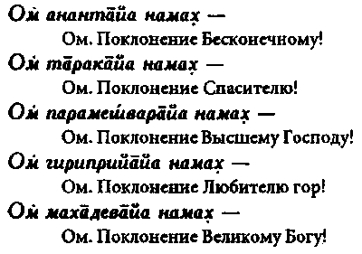 Ом — это Саччидананда, Парабрахман. «Намах Шивайя» означает «Поклонение Господу Шиве». Это — пятислоговая молитвенная формула (паньчакшара-мантра) Господа Шивы. Это чрезвычайно могущественная мантра, дарующая тому, кто повторяет ее, высочайшее блаженство Бытия.