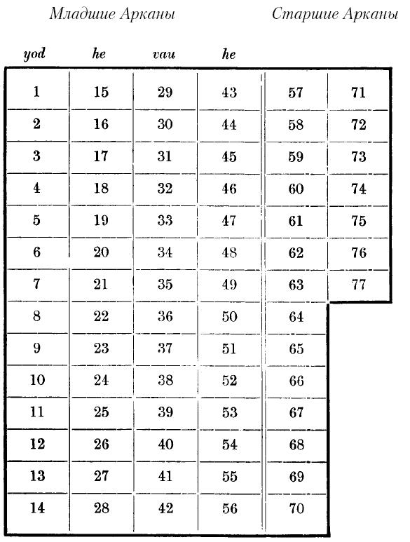 Для этого над рассматриваемой таблицей мы поместили соответствия старших и младших аркан и четыре буквы Тетраграмматона.