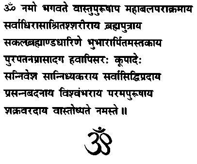 Ом! Я поклоняюсь всезнающему, всемогущему и святому Ваступуруше, чье присутствие хранит все жилища. Сын Брахмы, держатель всего творения, на чьи плечи возложена ответственность за эту планету, который всегда присутствует везде в городах и селениях, домах и храмах. Источник всего изобилия, всей красоты, сын космоса, высший Пуруша, податель благ, Господин жилищ, почтение Тебе!