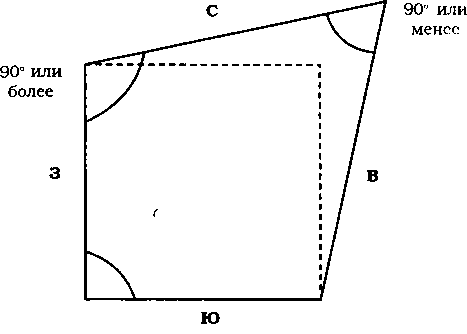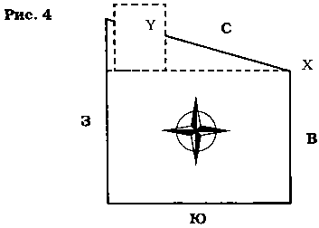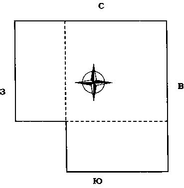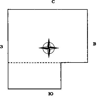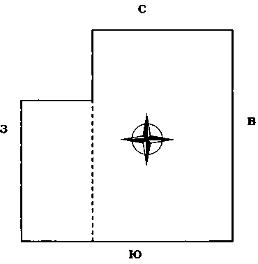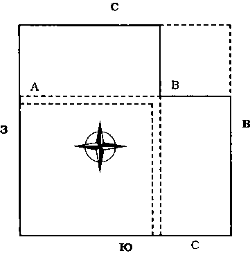 Участок с недостающим северо-восточным углом подобен телу без головы. Если возможно дополнительно купить землю вдоль отмеченной пунктиром линии, покупайте немедленно. Разделение участка вдоль двойной пунктирной линии А В означает в этом случае отрезание севера. Разделение участка по двойной пунктирной линии ВС означает отрезание востока. И то, и другое неблагоприятно.