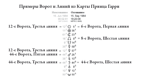 На прилагаемых к книге иллюстрациях вы могли увидеть, что в верхнем левом углу Карты жизни располагается таблица, в которой все имеющиеся Ворота определяются как осознанные (черные номера в правой колонке) и неосознанные (розовые номера в левой). Обратите внимание, что к каждому основному номеру как бирка привязан еще один, отмеченный более мелким шрифтом, как знак степени в математике. Это линии, которые указывают на уровни настройки Ворот, от 1 до 6. Например, на Карте жизни принца Гарри вы увидите, что цифра 12 стоит в третьей степени. Это означает, что 12-е Ворота характеризуются Третьей линией. Шестые Ворота, соответственно, Первой линией и так далее. На Карте это очень хорошо видно. Эти линии добавляют к характеру принца Гарри дополнительные оттенки.