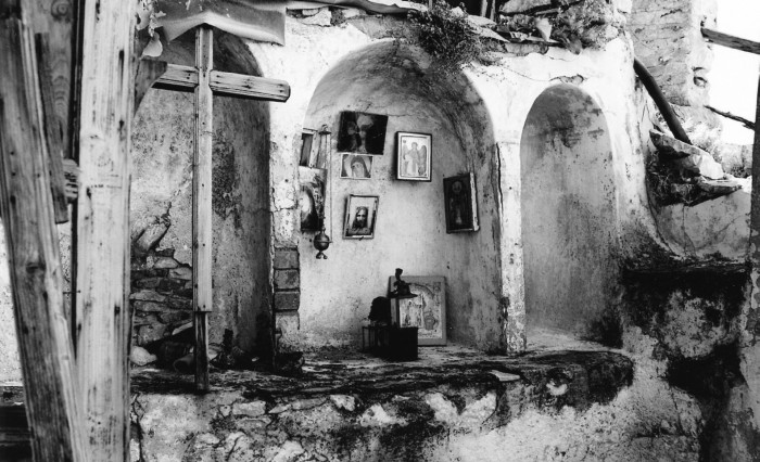 Дальше Каруля становится настоящей Карулей, знакомой нам по многим описаниям. По всему пути, метко прозванному о. X. «московской улицей», протянуты цепи. Без них ходить здесь было бы довольно опасно и под силу, наверно, только опытным альпинистам. По цепям же может пройти любой, и пишущие «всякие ужасы», мягко говоря, преувеличивают. Упасть можно, только выпустив цепь из рук. Тем не менее хозяин кельи, в которую сейчас нас привел «проспект», монах Пахомий, окончил свой земной путь именно таким образом — тело его выловили из моря. Что случилось, разумеется, никому не известно. Было это лет двадцать назад, и, видимо, с тех пор келья эта стоит пустая. Кажется, что нет ни одного уголка в этой келье, которого бы не коснулось разрушение. Говорят, что «время — лучший лекарь», но оно и лучший разрушитель. Каруля, опустевшая в период упадка афонского монашества в XX веке, сегодня постепенно заполняется монахами и ищущими монашеского жития. Может, когда-нибудь мы встретим насельника кельи Рождества Христова.