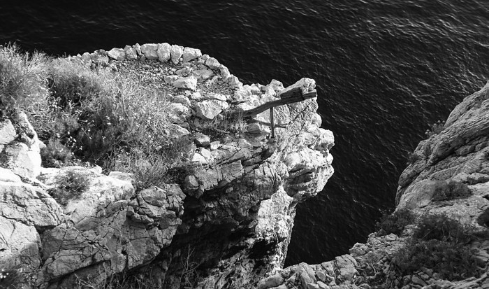 Еще дальше. Вот виден свет. Это выход. Здесь небольшая площадка над пропастью, на которой заметны следы пребывания человека. Некоторые современники пытаются подражать старцам. Но им частенько приходится иметь дело с полицией. Чтобы жить здесь, надо иметь хотя бы греческое гражданство, а лучше всего — хотя бы молчаливое согласие на это Лавры. Иначе возможен конфликт с полицией. Возвращаемся обратно бодрее: известной дорогой всегда идти легче. Поклоняемся честным останкам спасавшегося здесь старца. Скорее всего, это честная глава греческого старца Варфоломея, который был суровым аскетом и подвизался в сухоядении.