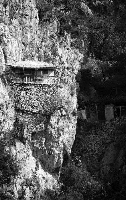 Дальше забираемся наверх в келью вмч. Георгия — самую древнюю келью Карули. «Там точию есть церковь мала, в честь святого великомученика Георгия создана, и три келейки, от неких добродетельных пустынножителей сербских созданная, иже тамо скитахуся. Во время же моего странствия греки жительствоваху, зело благоговейнаго и подвижнаго жития, три числом, един иеромонах, другий монах, а третий черноризец, подначальный, послушный, мало что от рукоделья, более же от милостыни ради нужднаго и неудобоприступнаго их места». Но не доходя до кельи вмч. Георгия, мы сворачиваем направо и поднимаемся по круче в Иверскую келью. Когда-то здесь жили два русских монаха: Александр и его ученик Андрей. Когда старец, подвижник высокой жизни, умер, то ученик его впал в прелесть и чуть не погиб. Однажды его нашли обезумевшим, и только незадолго до смерти он пришел в разум и все рассказал. Ему явился «Христос», отшельник поклонился ему до земли и увидел козлиные ноги. Бес расхохотался и вошел в него через рот. Это история из карульского предания, и мы несколько раз ее слышали. Видимо, ее же рассказывает и Павле Рак в своей книге. В этой келье нелегко жить: если другие размещаются на небольших ровных площадках, то эта напоминает крошечную квартирку, вокруг которой кругом обрыв. Если в обычной местности бывают спасающиеся в затворе, то здесь все в какой-то мере затворники. Если даже очень захочешь, не будешь часто карабкаться в соседнюю келью. Даже зная, что можешь что-либо купить в Дафни, сначала подумаешь, как это протащить по скале.
