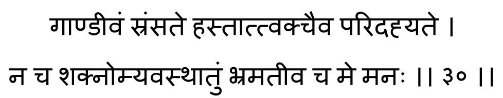 gANDIvam - боевой лук Арджуны по имени Гандива; sraMsate - выпадает; hastAt - из руки; ca еva - также воистину; tvak paridahyate - кожа пылает, сгорает; na ca zaknomy - и я не могу; avasthAtum - стоять; ca - и; me manaH - мой разум; bhramati iva - как будто блуждает, помутился.