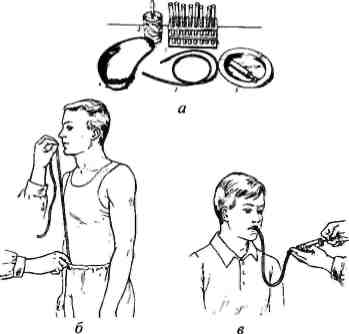 Рис. 19. Взятие желудочного сока: а – необходимые принадлежности: 1 – пробирки; 2 – тонкий зонд; 3 – пробный завтрак; 4 – лоток; 5 – шприц; б – измерение необходимой длины зонда; в – отсасывание желудочного сока