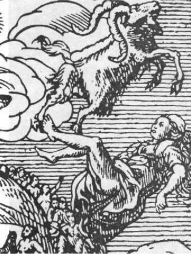 Неистовство ведьм в окрестностях Трира. Гравюра. Около 1600 г. Фрагмент. Летающих женщин подозревали в поджогах и насылании бурь.