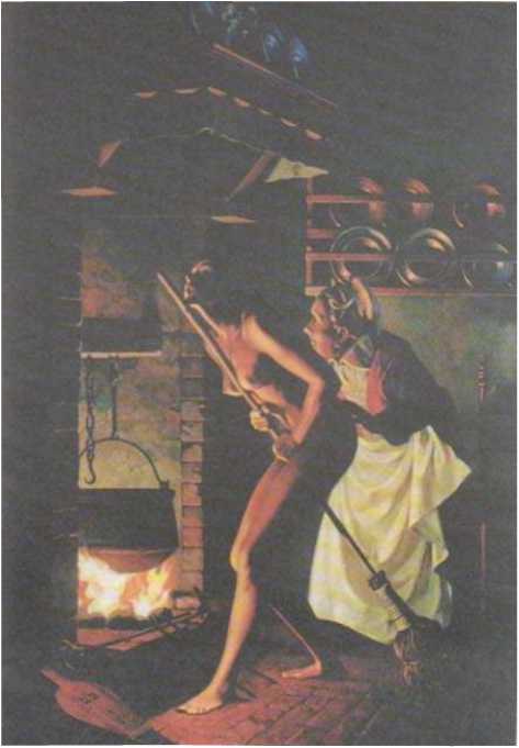 Натирание мазью. Рисунок М. Стича по картине Давида Тенирса. Вторая половина XVII в. В художественном языке явно просматриваются мотивы. Молодая колдунья наделена греческим профилем и стоит в безмятежной позе, характерной скорее для Венеры или Артемиды.