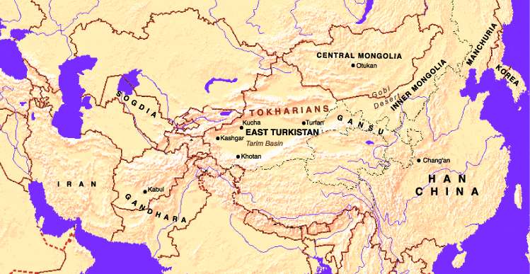 Недовольные правлением династии Тоба, большинство тюрок переселились западнее, в Ганьсу, под власть жужаней (400 – 551 гг.). Владения жужаней включали пустыни, луга и леса региона от Кучи до границ современной Кореи, а также значительную часть Монголии. Жужани постепенно перенимали тохарийскую и хотанскую формы буддизма, встречавшиеся в принадлежавших им городах-оазисах Восточного Туркестана, и распространяли их на своих землях. Древние тюрки также столкнулись с этой разновидностью буддизма, на которую повлияла иранская культура. В зороастрийской среде Будда стал «царем царей» и «богом богов».