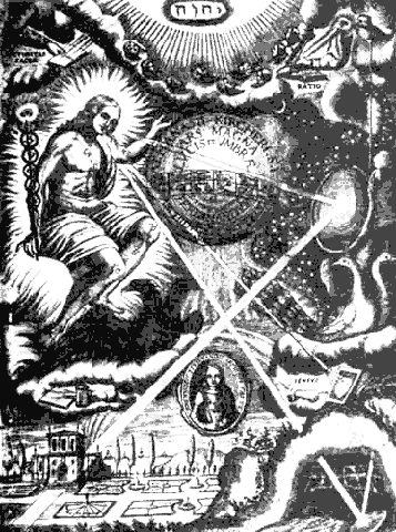 Взглянув (илл. 9) на фронтиспис сочинения, опубликованного в 1646 году иезуитом Афанасием Кирхером, одним из самых известных последователей герметико-кабалистической традиции, основанной Пико, мы увидим Имя на еврейском языке, окруженное лучами и облаками, в которых различимы сонмы ангелов. Под ними находится небесный мир с зодиаком; а ниже — подлунный мир, которым правит эрцгерцог Фердинанд III. Основные концепции, описанные в этой главе, не изменились: иллюстрация демонстрирует, что барокко с его славой лучей и роями ангелов отлично уживалось с этими концепциями.
