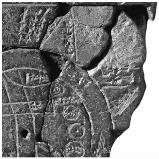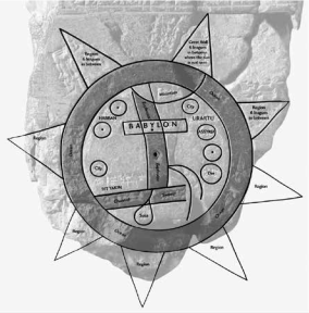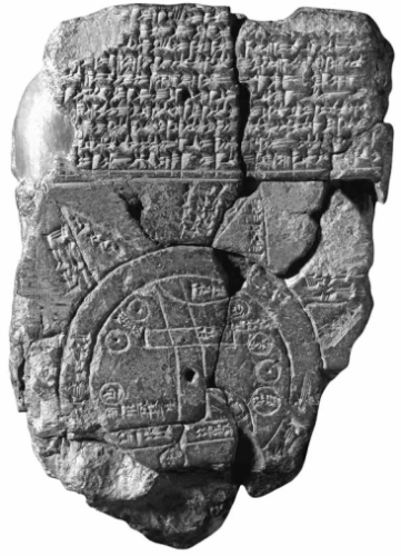 Перед нами – ни больше ни меньше как карта всего мира. Клинописная табличка, на которой она изображена, – одна из самых удивительных, когда-либо раскопанных, – получила даже среди ассириологов собственное латинское название mappa mundi[150], соревнуясь с другими претендентами на данный титул [120]. Кроме того, это древнейшая известная нам карта мира, изображенная на клинописной табличке [121].