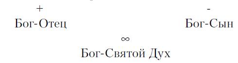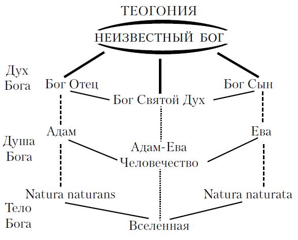 Бог-Отец, принцип Воли, полностью отражается в диком Адаме, принципе Силы; Бог-Сын, принцип Разума и способности к пониманию, отражается в кроткой Еве, принципе Власти. Наконец, Бог как целое или Бог Святой Дух облекает два первых мистических союза в плоть и производит их реальность в уравновешенное создание Адама-Евы или Человечества.