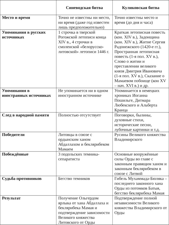В связи с этим будет полезным сравнить основные характеристики Синеводской и Куликовской битв, представив их для наглядности в виде таблицы. Но сначала имеет смысл сказать несколько слов об источниках. Самым ранним упоминанием о битве на Синих водах является лаконичное сообщение тверской Рогожской летописи, законченной в 1396 г.: «Въ лето 6871 (1362—1363 г.) … Тое же осени Олгердъ Синю воду и Белобережие повоевалъ»880.