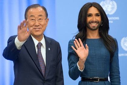 Особое внимание защите прав извращенцев уделяет и нынешний Генеральный секретарь ООН Пан Ги Мун, принявший австрийского травести Тома Нойвирта, выступающего под псевдонимом Кончиты Вурст, в штаб-квартире ООН в Вене в ноябре 2014 г. во время встречи, посвященной вопросам прав ЛГБТ-соощества. Вурст был назван Пан Ги Муном «символом прав человека».