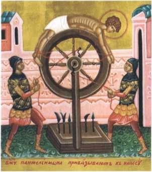 Из зависти врачи донесли императору, что святой Пантелеимон лечит христианских узников. Максимиан уговаривал святого опровергнуть донос и принести жертву идолам, но святой Пантелеимон исповедал себя христианином и на глазах императора исцелил расслабленного Именем Иисуса Христа. Ожесточенный Максимиан казнил исцеленного, восславившего Христа, а святого Пантелеимона предал жесточайшим мукам. Господь явился святому и укрепил перед страданиями. Великомученика Пантелеимона повесили на дереве и рвали железными когтями, обжигали свечами, потом растягивали на колесе, бросали в кипящее олово, ввергали в море с камнем на шее. Во всех истязаниях великомученик оставался невредимым и с дерзновением обличал императора. В то же время перед судом язычников предстали пресвитеры Ермолай, Ермипп и Ермократ. Все трое твердо исповедали свою веру во Спасителя и были обезглавлены. По повелению императора великомученика Пантелеимона бросили на растерзание диким зверям в цирке. Но звери лизали его ноги и отталкивали друг друга, стараясь коснуться руки святого. Зрители поднялись с мест и стали кричать: «Велик Бог христианский!» Разъяренный Максимиан приказал воинам рубить мечами всех, кто славил Имя Христово, а великомученику Пантелеимону отрубить голову. Святого привели на место казни и привязали к масличному дереву. Когда великомученик молился, один из воинов ударил его мечом, но меч стал мягким, как воск, и не нанес никакой раны. Святой окончил молитву, и послышался Голос, звавший страстотерпца по имени и призвавший в Небесное Царство. Услышав Голос с Неба, воины упали перед святым мучеником на колени и просили прощения. Палачи отказались продолжать казнь, но великомученик Пантелеимон повелел выполнить приказ императора, сказав, что иначе они не будут иметь с ним части в будущей жизни. Воины со слезами простились со святым, целуя его. Когда мученику отсекли голову, из раны потекло молоко. Маслина, к которой был привязан святой, в момент его смерти покрылась плодами. Многие присутствующие при казни уверовали во Христа. Тело святого, брошенное в костер, осталось в огне неповрежденным и было погребено христианами в 305 году. Слуги великомученика Пантелеимона Лаврентий, Вассой и Провиан видели его казнь и слышали Голос с Неба. Они написали повествование о жизни, страданиях и кончине святого великомученика.