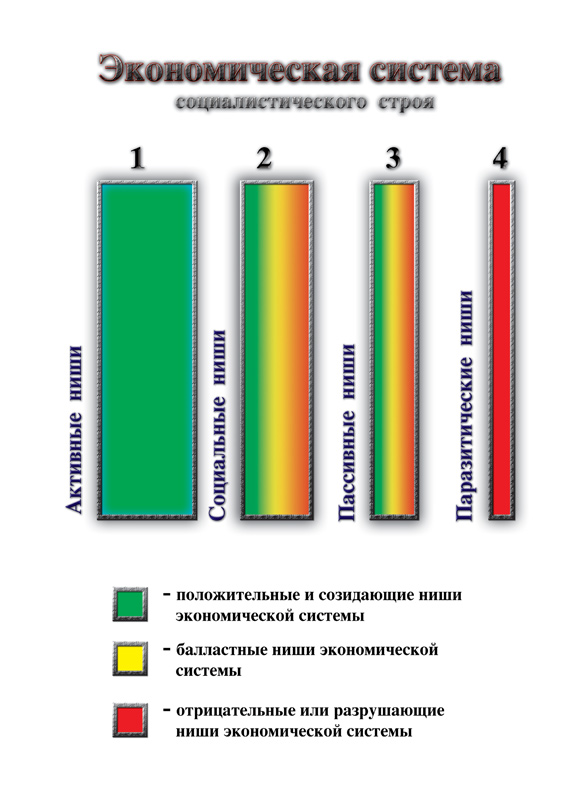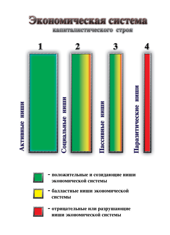 возникает РЕАЛЬНАЯ ВОЗМОЖНОСТЬ у СОЦИАЛЬНЫХ ПАРАЗИТОВ (Тёмных Сил) захватить реальную власть в социальных системах. И когда им удаётся полностью это осуществить, они создают экономическую систему, в которой социальные паразиты контролируют все категории экономических ниш, включая категорию активных экономических ниш. Причём, им нет надобности ВЫТЕСНЯТЬ кого–либо из категории активных экономических ниш. Социальным паразитам это просто не нужно, они не имели и не имеют желания сами, своими руками создавать что–либо или производить что–либо. Они предпочитали и предпочитают лишь ПОЖИНАТЬ ПЛОДЫ ЧУЖОГО ТРУДА. Поэтому социальные паразиты предпочитают захватывать, явно или скрытно, социальные и пассивные экономические ниши экономической системы. Когда социальным паразитам удаётся открыто захватить контроль над экономической системой, они создают социальный организм под себя и называют оный СОЦИАЛИСТИЧЕСКИМ СТРОЕМ, который, по своей сути, представляет ГОСУДАРСТВЕННЫЙ КАПИТАЛИЗМ, ПЛЮС РАБОВЛАДЕЛЬЧЕСКИЙ СТРОЙ (см. Рис. 32).