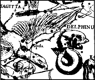 Созвездие, по моему толкованию, изображающее Кита Камы, героя песен о Крышне-Коляде, греками толкуется как созвездие Дельфина. Греки говорят, что этот Дельфин доставил Посейдону Амфитриту из царства Атланта. В «Звёздной книге Коляды» есть упоминание о том, как Поддонный Царь Ильм Водный женился на дочери Святогора (он же Атлант) Златогласке. Надо полагать, что славяне помнили и о Дельфине, участвовавшем в этой истории. Однако саму женитьбу славяне относят совсем в иное время (в эпоху Девы-Майи). На линии, соединяющей Деву и Овна, расположено другое созвездие — Рыбы-Кита, который, возможно, участвовал в похищении Златогласки. Так что остаётся открытым вопрос, находится ли в секторе Крышня-Коляды созвездие похитителя Златогласки (Амфитриты).