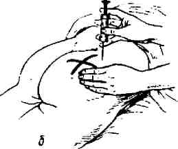Больной лежит на животе или на боку при введении лекарства в область ягодицы или на спине при введении в переднюю поверхность бедра. Шприц держат таким образом: II палец придерживает поршень, V палец – муфту иглы, а остальные пальцы держат цилиндр. Положение шприца должно быть перпендикулярно поверхности тела больного. Решительным движением вводят иглу в середину кожной складки на глубину 7–8 см, оставляя 1 см над муфтой, так как в этом месте игла чаще всего ломается. После этого необходимо потянуть поршень на себя, убедиться, что игла не находится в кровеносном сосуде (кровь не появляется в шприце), а после этого нажать на поршень, постепенно вытесняя раствор до конца. Кожу вокруг места прокола натягивают левой рукой. Удалять иглу следует быстрым движением, прижимая к коже ватный тампон, смоченный в спирте.