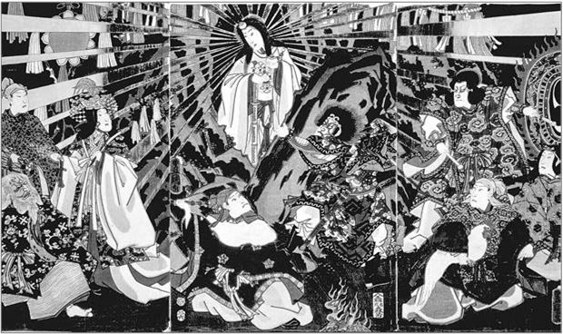 Рис. 125. Аматерасу, выходящая из пещеры (красочная печать с деревянных досок, период Эдо, Япония, XIX в. н. э.)
