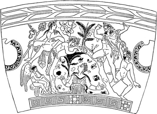Именно таким способом оживает Богиня, она возвращается к жизни благодаря смеху. Это – момент просветления, анодос, или возвращение Богини. Семя, которое хранилось в царстве Аида во время сухого лета, теперь выходит на поверхность, как буйство жизни во время осеннего сева. На этой вазе (рис. 127) Персефону окружают купидоны и сатиры, фаллические и растительные изображения. Дионис держит в руке свой деревянный жезл тирс, увитый плющом, и, таким образом, дионисийские ассоциации тесно переплетаются с элевсинскими мистериями.