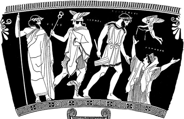 На первый взгляд кажется, что мы видим величественную фигуру, которая поднимается из-под земли с простертыми руками. Кроме того, там изображен мужчина с молотом и ожидающий ее Гермес. Нам кажется, что мы видим знакомую сцену вознесения Коры или Геи. Не будь там никаких надписей, это изображение можно было бы трактовать именно так. Но дело в том, что каждая фигура тщательно подписана. Слева – Зевс, рядом с ним – Гермес, затем – Эпиметей и, наконец, не Гея и не Кора, а Пандора. Над Пандорой, приветствуя ее восхождение, парит бог любви с повязкой для волос в протянутых к ней руках. Пандора поднимается вверх из-под земли, она – Земля, та, что приносит дары.[143]