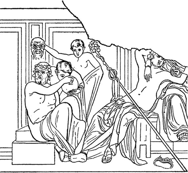 Есть два изображения ритуала дионисийской инициации в Вилле Мистерий в Помпеях (I в. до н. э.), которые дают нам представление о том, что там происходило. На первом изображении (рис. 130) молодая женщина, проходящая инициацию, положила голову на колени женщины постарше, а та смотрит на ангела, который занес над девушкой хлыст. У обнаженной танцовщицы в руках цимбалы или кастаньеты. Стоящая перед ней женщина одета в темную хламиду, а в руке у нее тирс, или жезл.