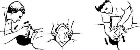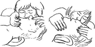 Для того чтобы избежать западания языка, нижнюю челюсть пострадавшего выдвигают вперед, как показано на рис. 12. Если челюсти больного крепко сжаты, их следует осторожно раздвинуть каким-нибудь плоским предметом (черенком ложки и т. п.), положить между зубами валик из бинта или ткани. После этого пальцем, обернутым платком или марлей, быстро обследовать полость рта и освободить ее от рвотных масс, слизи, крови, песка (съемные зубные протезы нужно снять). Затем расстегнуть одежду пострадавшего, затрудняющую дыхание и кровообращение.