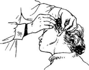 Для закапывания капель в ухо нагибают голову больного в здоровую сторону. Мочку уха больного левой рукой немного оттягивают, а правой держат пипетку и отсчитывают капли поступающие в слуховой проход. После этого в ухо закладывают небольшой ватный тампон на несколько минут (рис. 8).