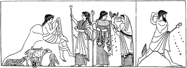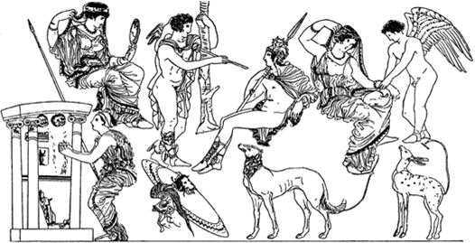Гермес обращается к Парису, чтобы тот решил, какая из богинь прекраснее. Афродиту наряжает Эрос, надевая ей на руку браслет. Вы видите пса Гермеса и оленя, который ассоциируется с Артемидой, но может сопровождать любую из этих богинь. Гера чинно наряжается, как и подобает почтенной даме, а Афина, как замечает Джейн Харрисон, «решила просто как следует помыться».[118]